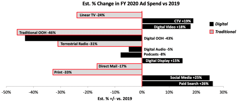 Tradisjonelle medier kommer til å være langt, langt nede. Det ser ut til at kjøpere flytter budsjettet fra lineær TV, bannere, radio, post og utskrift til digitale kanaler. Noen tradisjonelle kanaler er ned med mer enn 30% i IAB-projeksjonen.
